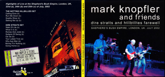 01. Mark Knopfler & Friends - Calling Elvis (08:07) 02. Mark Knopfler & Friends - Run Me Down (04:08) 03. Mark Knopfler & Friends - Quality Shoe (04:55) 04. Mark Knopfler & Friends - Setting Me Up (04:22) 05. Mark Knopfler & Friends - Walk Of Life (05:37) 06. Mark Knopfler & Friends - What It Is (05:45) 07. Mark Knopfler & Friends - Romeo And Juliet (10:21) 08. Mark Knopfler & Friends - Sultans Of Swing (06:59) 09. Mark Knopfler & Friends - Oe Oe (01:20) 10. Mark Knopfler & Friends - Your Latest Trick (06:13) 11. Mark Knopfler & Friends - Why Aye Man (07:09) 12. Mark Knopfler & Friends - Money For Nothing (06:13) 13. Mark Knopfler & Friends - Going Home (06:04)